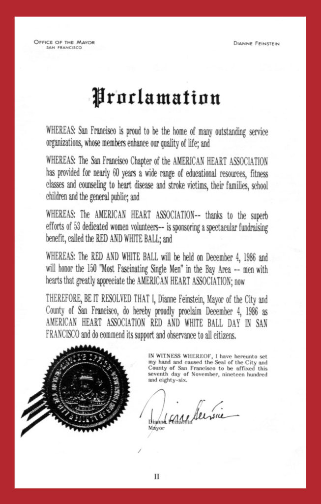 Pari Livermore’s inaugural Red and White Ball fundraiser for the American Heart Association was honored by the City of San Francisco, which declared December 4, 1986 to be “American Heart Association Red and White Ball Day.”
